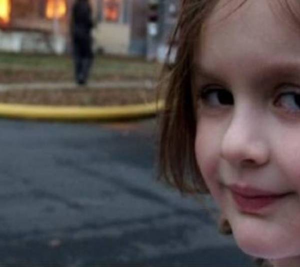 fondo donde se puede ver un voraz incendio, una niña norteamericana se hizo viral en las redes sociales por su sonrisa "diabólica" , a tal punto de convertirse en un chistoso meme.