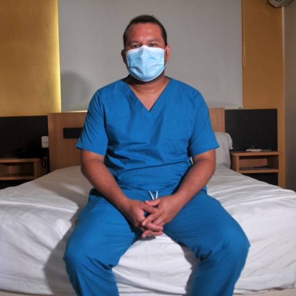 Palacios está alojado con otros 30 profesionales en el Corona Real, un hotel de cuatro estrellas de Guayaquil habilitado como albergue para quienes están haciendo frente al nuevo coronavirus en los hospitales.
