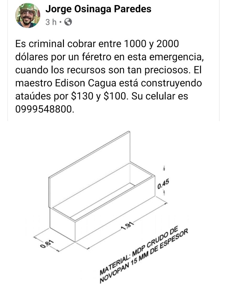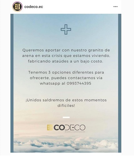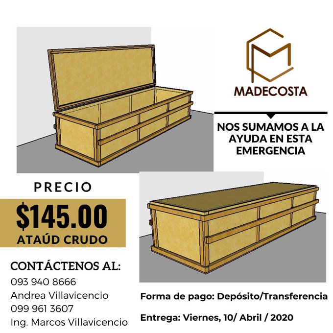 Iana Home de Diana Solá, es una empresa dedicada a la construcción y a la decoración de interiores. "Tenemos nuestro trabajo detenido y nuestros maestros necesitan ganar también, además esta es una forma de ayudar a darles a las personas un entierro digno". Dice que hasta el momento ha recibido más de 20 llamadas y más de trece llamadas de personas desesperadas por obtener un ataúd.