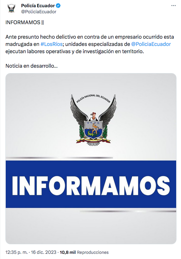 Este presunto hecho delictivo en contra del ejecutivo es investigado por las unidades especializadas de la Policía Nacional, quienes ejecutan labores operativas y de investigación en territorio.