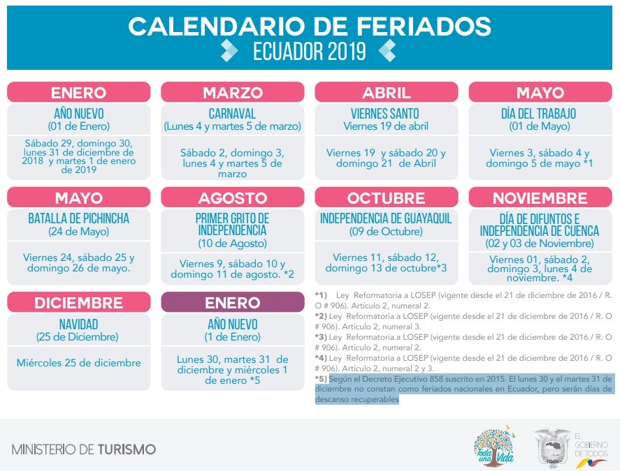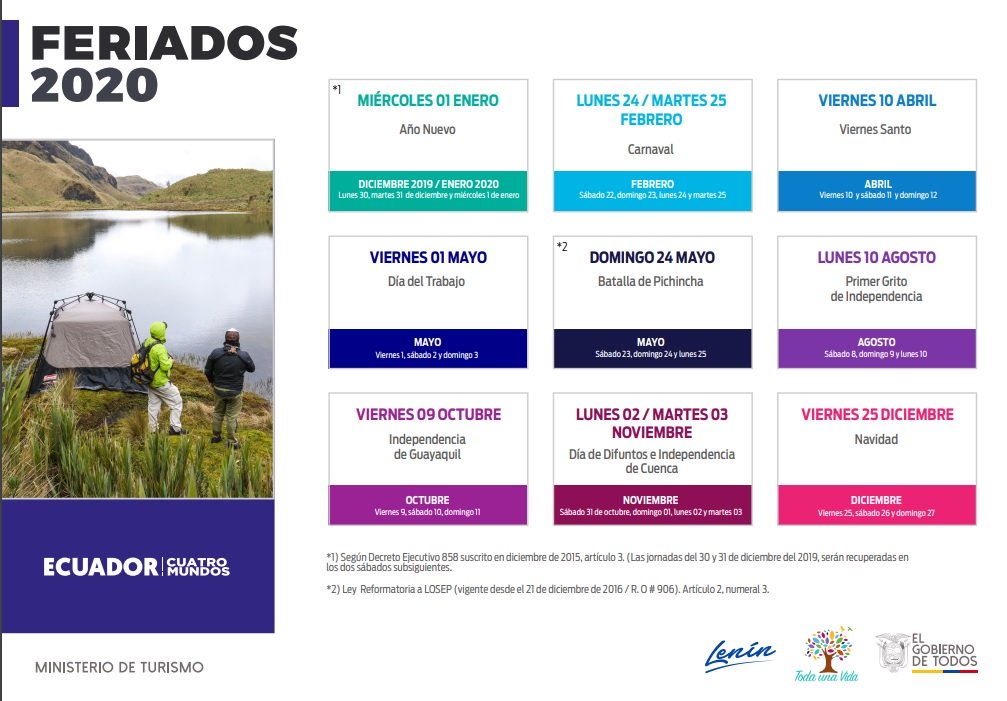 Incluso, el Ministerio de Turismo confirmó este 22 de noviembre de 2019 el calendario de feriados nacionales para el 2020: habrá 27 días de descanso. A estos días de asueto deben agregarse los días de feriado locales en las diferentes ciudades del Ecuador.