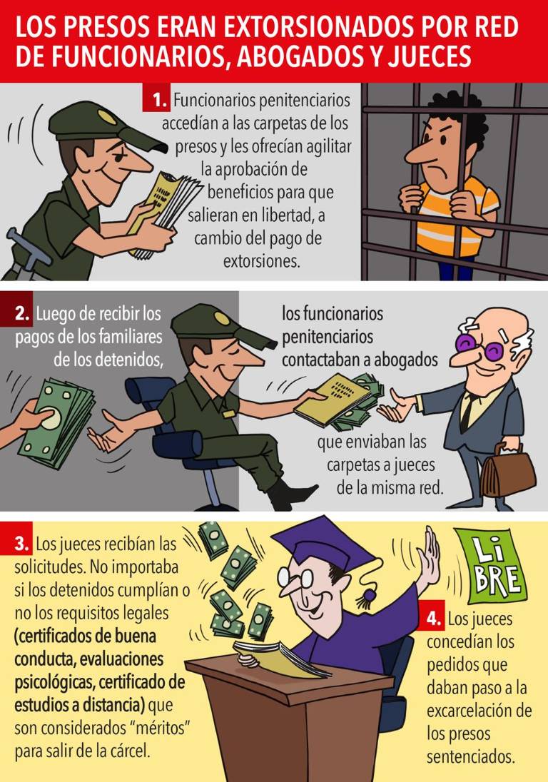 Según la investigación fiscal, entre 2015 y 2019 esta red facilitó la excarcelación de unos 90 detenidos por delitos graves, en su mayoría por narcotráfico. Los reclusos obtuvieron privilegios que les permitieron salir en libertad, a pesar de no cumplir con todos los requisitos legales. En otros casos eran obligados a pagar las coimas, pese a que sí reunían las condiciones para su liberación.