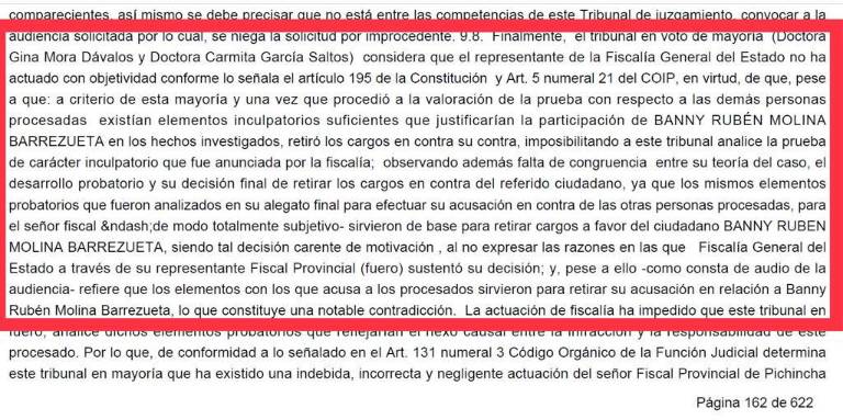 “A nuestro criterio, y una vez que procedió a la valoración de la prueba sobre las demás personas procesadas, existían elementos inculpatorios suficientes que justificarían la participación de Banny Molina en los hechos investigados”, destacaron en la sentencia. No obstante –agregaron–, Santillán retiró los cargos, “imposibilitando a este tribunal analizar la prueba inculpatoria que fue anunciada por la Fiscalía”. Tras describir las contradicciones de Santillán, las juezas pidieron al CJ que investigara su actuación.