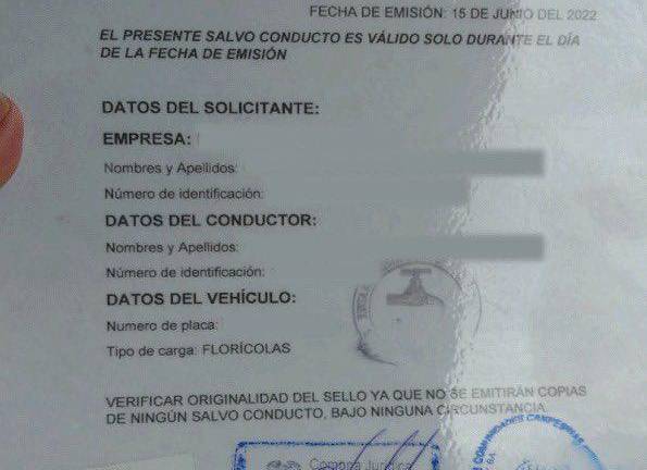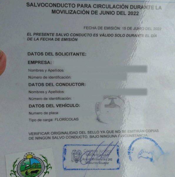 Expoflores publicó una foto del supuesto permiso, que tiene membrete de la Comuna Jurídica Simón Bolívar, del cantón Pedro Moncayo-Tabacundo, provincia de Pichincha. El documento pide datos de la empresa, el conductor y el vehículo. Además, advierte que será válido solo en el día de la emisión.