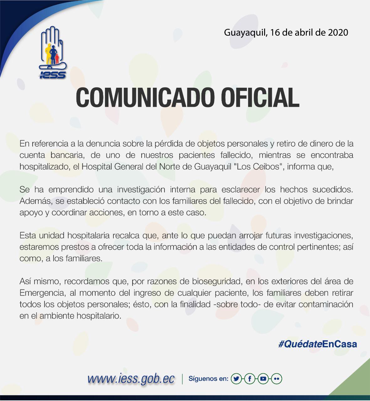 Al respecto, el Hospital del IESS de Los Ceibos emitió un escueto comunicado en el que informa que "se ha emprendido una investigación interna para esclarecer los hechos sucedidos (...) esta unidad hospitalaria recalca que, ante lo que puedan arrojar futuras investigaciones, estaremos prestos a ofrecer toda la información a las entidades de control así como a los familiares".