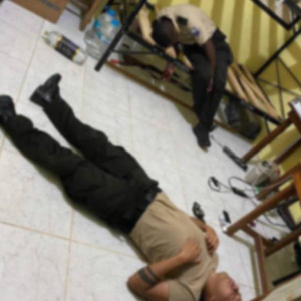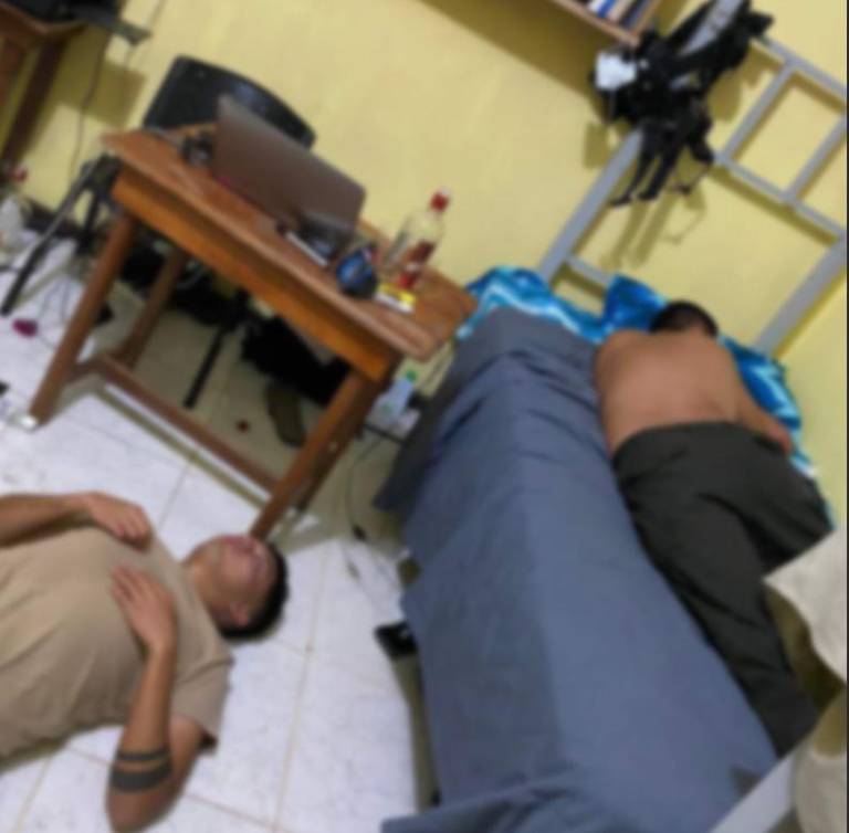 En una de las imágenes se observa botellas de licor, así como dos hombres acostados y vestidos con uniforme similar al de la institución: uno está boca arriba sobre el piso, y el otro está tirado encima de una litera.