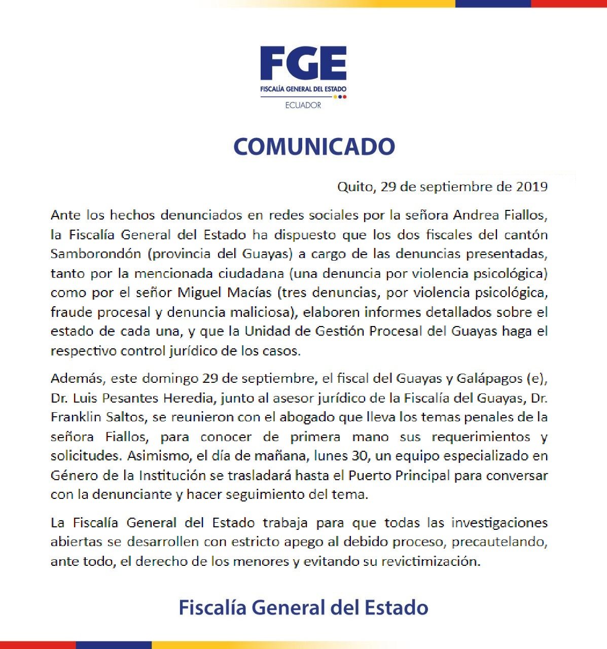 En tanto, la Fiscalía General del Estado había dicho los dos fiscales de Samborondon a cargo de las denuncias presentadas tanto por Fiallos como por su expareja, Miguel Macías, elaboren informes sobre su estado y se haga el vigilamiento jurídico respectivo para cada caso.