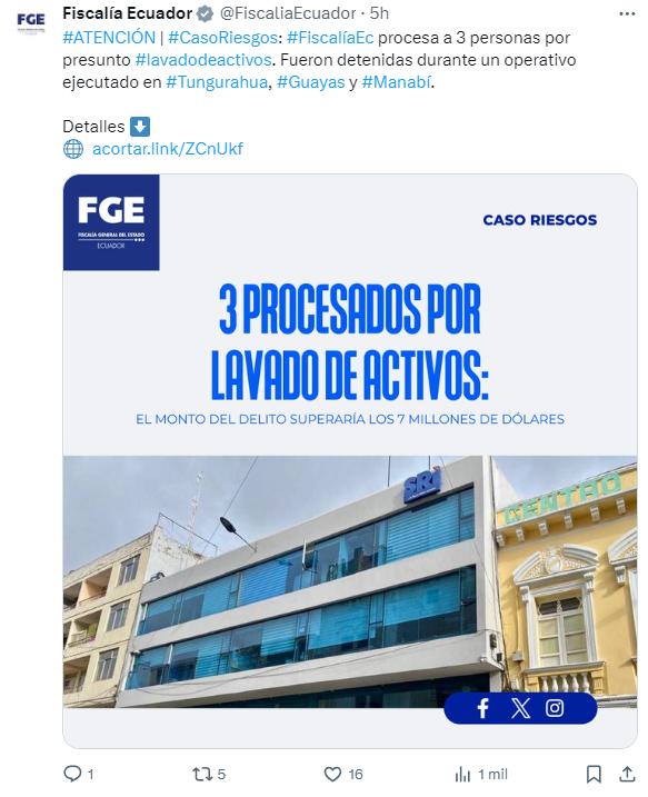 La Fiscalía General del Estado informó este sábado 18 de mayo que procesa a tres personas -una de ellas accionista de 27 empresas-, por el presunto delito de lavado de activos en el caso 'Riesgos'.