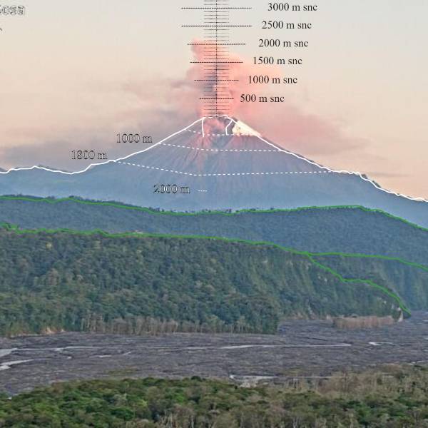 El Reventador también ha registrado esta madrugada episodios de incandescencia a nivel del cráter, cuyo material luego ha descendido unos 400 metros por la pendiente del flanco sur.