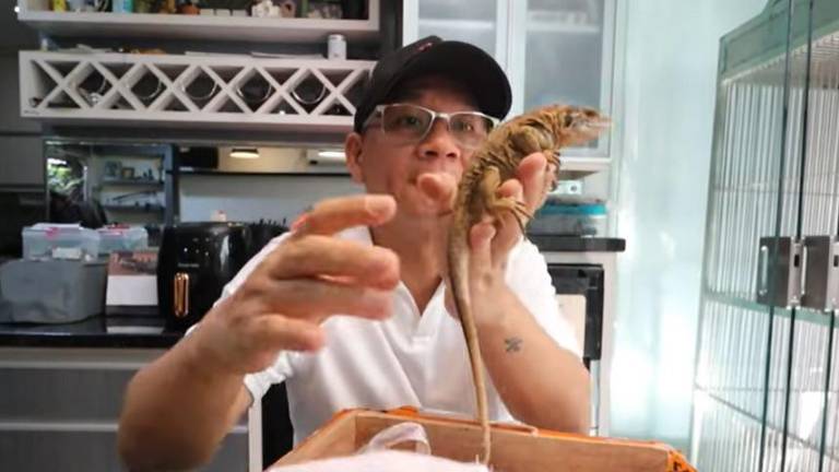 Después de eso, saca de la bolsa a otra iguana que, afirma, es la hembra. Por el tamaño de los reptiles, se puede observar que son aún jóvenes.