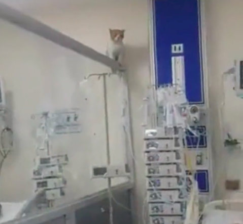 En el clip se observa al gato trepado en un separador y alrededor de él los pacientes en estado crítico. Personal de la casa de salud dicen en el video que la mascota se encuentra asustada.