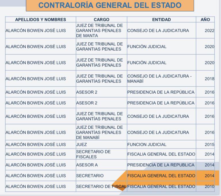 En 2010, Alarcón Bowen fue secretario de Fiscalía. Para 2014, ya actuaba como asesor jurídico de la Presidencia de la República, en el segundo período de Rafael Correa en el poder. Un distributivo de la época lo muestra como asesor 2 en la Secretaría General Jurídica, que a esa época estaba liderada por Alexis Mera, hoy sentenciado y preso por el caso Sobornos.