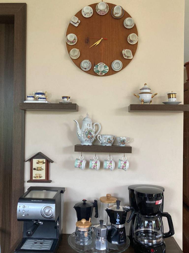 Los años pasaron y ese sueño quedó guardado en algún lugar de su corazón. Hasta que un día visitó a la prima de su esposo en Cuenca. “Tenía una casa muy bonita y frente al comedor donde nos invitó a tomar un café, puede observar una vitrina con tazas. Enseguida pensé: qué hermoso tener tantas y varias. Así empezó esta afición”.
