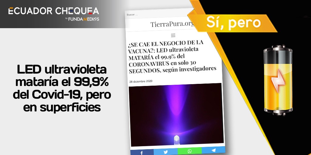 La publicación titulada “¿Se cae el negocio de la vacuna?: LED ultravioleta mataría el 99,9% del coronavirus en en sólo 30 segundos”, hace referencia a una investigación de la Universidad de Tel Aviv que habría demostrado que el coronavirus se puede eliminar de manera eficiente, rápida y económica utilizando diodos emisores de luz ultravioleta (UV) (UV-LED) en frecuencias específicas.