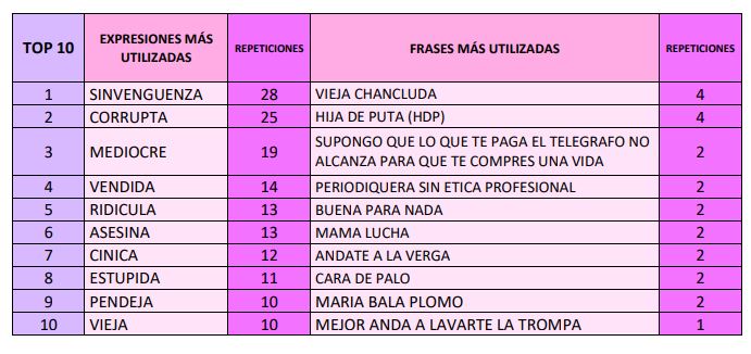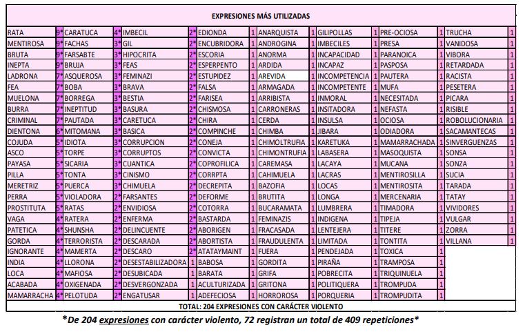 En un listado elaborado por Participación Ciudadana se detallan las 204 expresiones con carácter violento y las frases más recurrentes en redes sociales: "bruta, inepta, payasa, gorda, caratuca, ladrona, mentirosa, buena para nada, cara de palo, María Bala Plomo, entre otras".