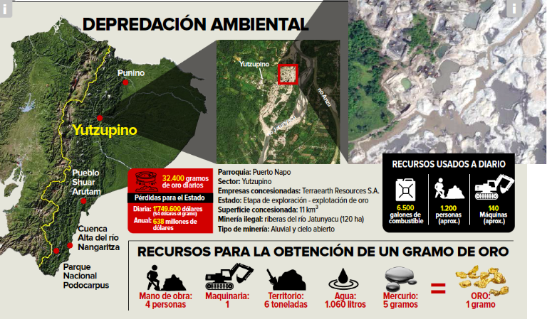 En febrero de 2022, el gobierno realizó una intervención con cientos de militares y policías en Yutzupino, también en Napo. Encontraron más de 600 operarios en dos centenares de máquinas retroexcavadoras, en cuencas hídricas desde las cuales se extraía el mineral. Luego del operativo, varias personas fueron detenidas. Entre ellos, funcionarios públicos de la época.