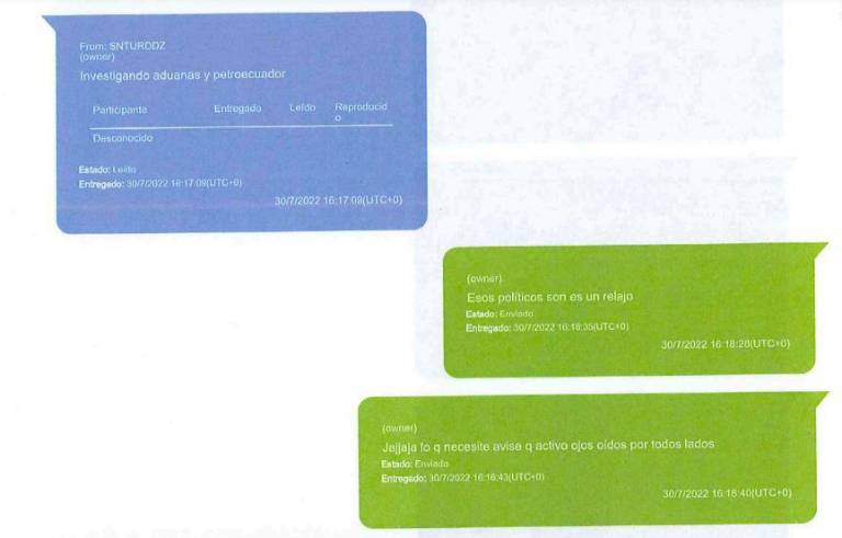 En un extracto en el que la Fiscalía detalla que el tema central es "apoyo en redes sociales e información de empresas públicas por parte de Norero", el usuario identificado como Boscán saluda a Norero y le comunica que se encuentra "peleando con políticos e investigando aduanas y Petroecuador". La fecha de los mensajes es del 30 de julio del 2022.