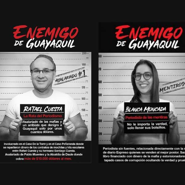 “Enemigo de Guayaquil” es la etiqueta que sospechosas cuentas de Twitter y Facebook han dado a cinco periodistas: Blanca Moncada (Expreso), Rafael Cuesta (TC), Andersson Boscán (La Posta), Tania Tinoco (Ecuavisa) e Isabel Crespo (Ecuavisa). ¿Qué tienen en común todas estas personas? Tres de ellos han realizo labores de investigación que destaparon sospechosos contratos firmados por la administración de la ciudad de Guayaquil. Los otros dos (Tinoco y Boscán) no saben por qué han sido víctimas de las campañas de desprestigio.