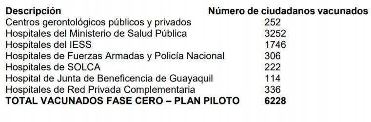 El Ministerio de Salud, mediante un boletín, dio a conocer que en la fase cero o piloto del Plan Nacional de Vacunación, que inició el jueves 21 de enero del 2021, se ha administrado la primera dosis a 6.228 ecuatorianos, en las 24 provincias del país. Esto de un total de 8.190 dosis de Pfizer, que llegaron al país.
