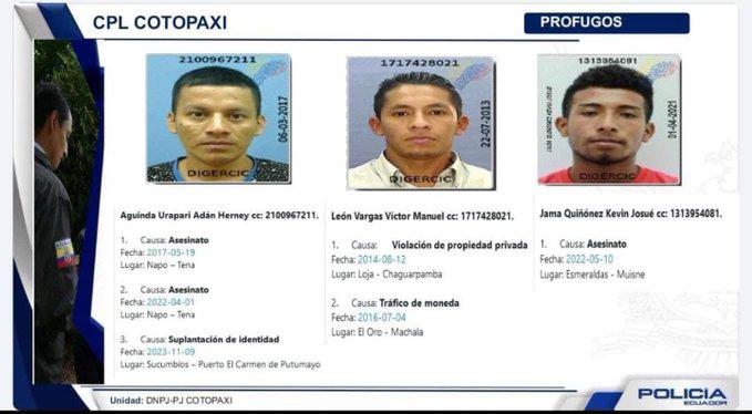Las Fuerzas Armadas (FF.AA.) confirmaron la fuga de tres presos del pabellón de máxima seguridad de la cárcel de Cotopaxi, reportada este viernes 23 de febrero de 2024.