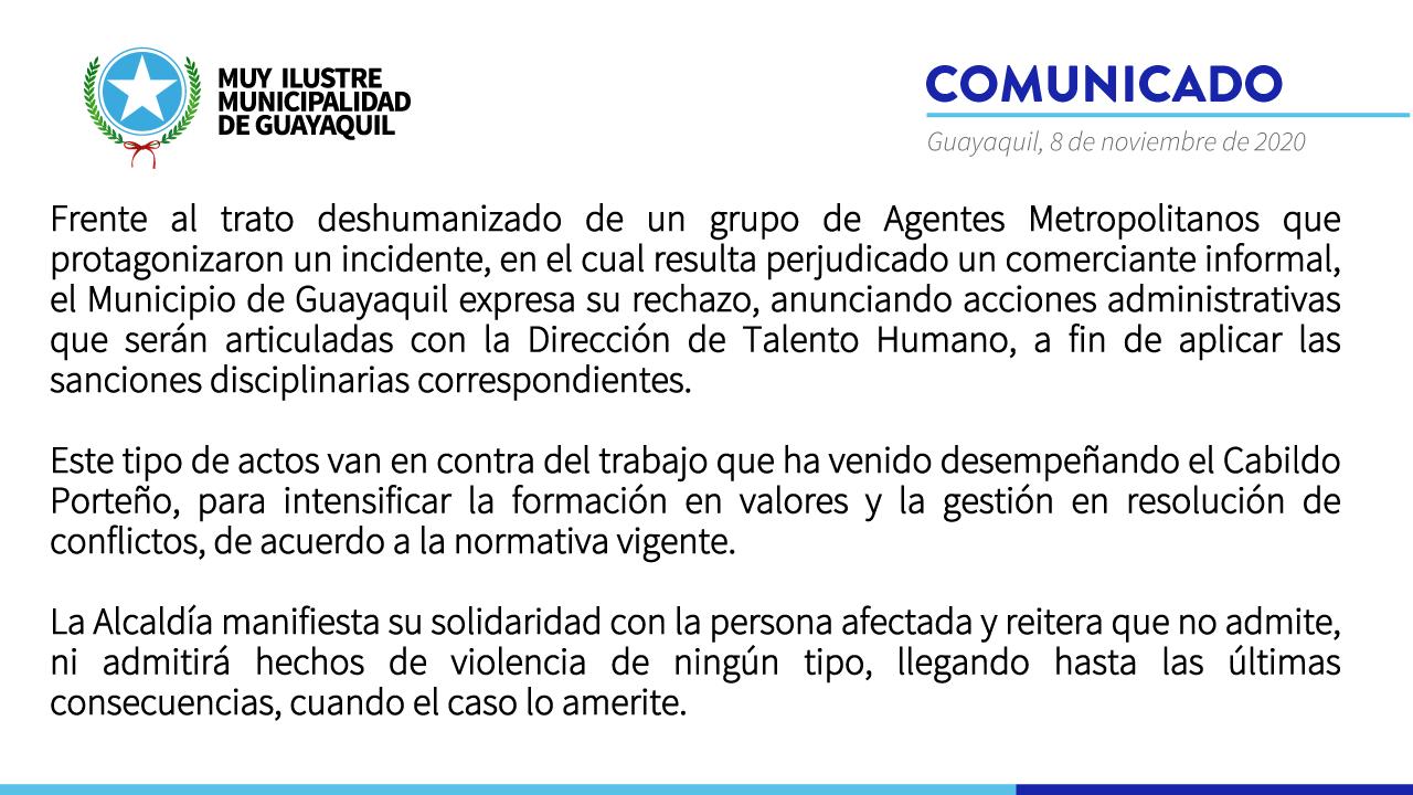 En un comunicado, el Municipio de Guayaquil expresó su rechazo al "trato deshumanizado" del grupo de agentes metropolitanos e indicó que tomarán acciones administrativas que serán articuladas con la Dirección de Talento Humano, para aplicar sanciones disciplinarias a los involucrados en este hecho.