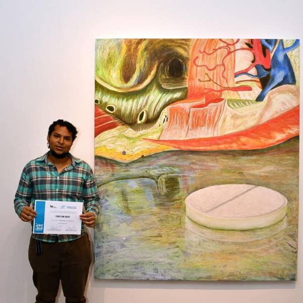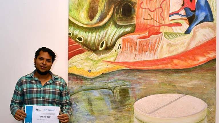 Godoy, de 26 años, obtuvo el primer lugar con su obra titulada: "La paradoja del sueño". Su creación artística fue realizada sobre lona con lápices de colores, marcadores y grafito.