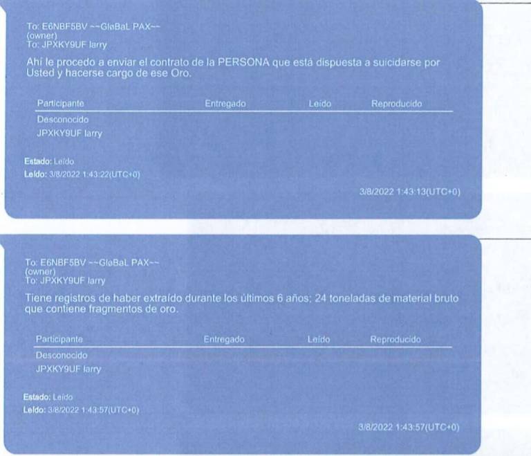 “Le envío el contrato de la persona que está dispuesta a suicidarse por usted y hacerse cargo de ese oro”, le advierte su abogado en uno de los chats, en alusión a que con los papeles formales de la explotación de ese empresario minero se iba a blanquear el oro ilegal. “Tiene registros de haber extraído durante los últimos seis años, 24 toneladas de material bruto que contiene fragmentos de oro”, se lee en el chat.