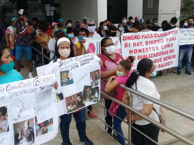Varias personas con Insuficiencia Renal Crónica (IRC) protestaron junto a sus familiares la mañana de este jueves 9 de julio, en las afueras de la sede del Ministerio de Salud en Guayaquil, para exigir al Estado que pague la deuda que mantiene desde el año pasado con los centros de diálisis.