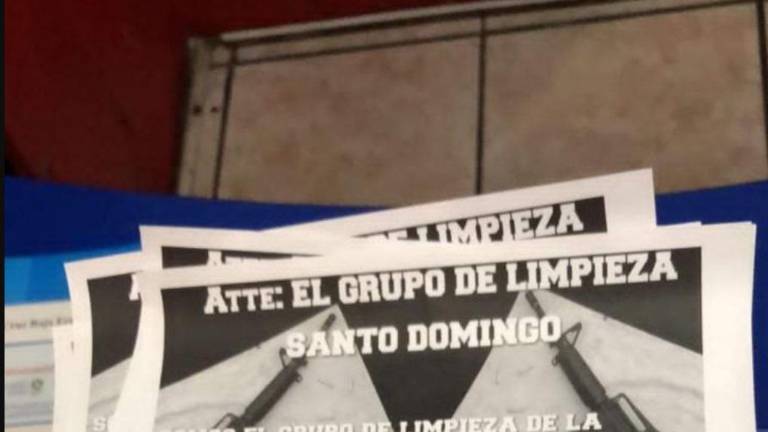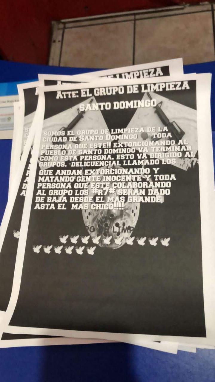 "Somos el grupo de limpieza de la ciudad de Santo Domingo", se lee en una hoja impresa, en donde además se visualizan dos fusiles. La advertencia está dirigida a los extorsionadores que operarían en la localidad y en específico al grupo delincuencial llamado R7.