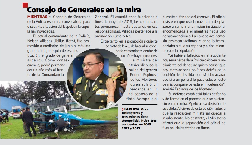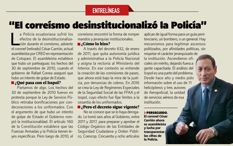 Conocí el informe y anuncié una reunión con el Consejo de Generales, pues quiero que todos estén enterados de lo que se encontró y de las decisiones a tomar”. La actual ministra asumió funciones en septiembre de 2018, con una promesa de reinstitucionalizar la Policía. Revisar las decisiones que afectan la seguridad social debe ser uno de los cambios.