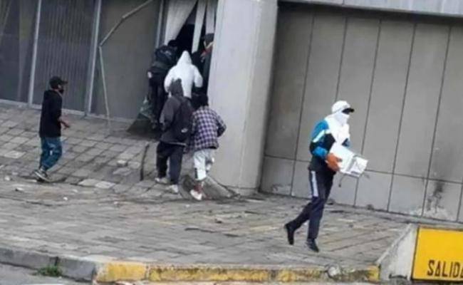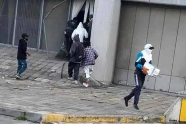 En medio de la destrucción en curso, César Lenin —cubierto con un pasamontañas— se llevó un monitor y un CPU de la Fiscalía de Tránsito, con los que lo encontraron momentos después.