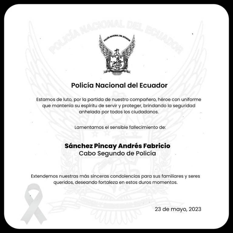 "¡No descansaremos hasta capturar a los culpables!", manifestó el comandante General de la Policía, Fausto Salinas, quien en nombre de la institución expresó su "profundo sentido de pesar, ante el fallecimiento de nuestro compañero #CbosAndrésSánchez, que Dios conceda la fortaleza necesaria a todos sus familiares ante tan irreparable pérdida".