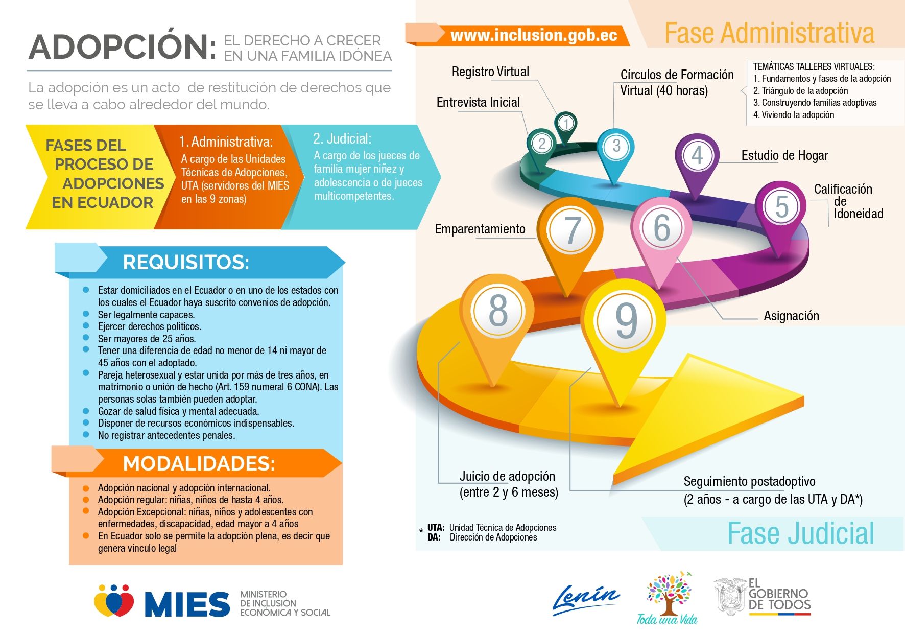 El proceso comienza en una fase administrativa con un registro virtual en la página del MIES. En esa se detallan todos los requisitos y modalidades, como por ejemplo, ser mayores de 25 años, no registrar antecedentes penales, disponer de recursos económicos, entre otros. Luego se da una entrevista por personal de la Unidad Técnica de Adopciones (UTA) del MIES a la/s persona/s interesada/s. Pueden adoptar parejas heterosexuales casadas o unidas, así como también personas solteras. No obstante, entre los requisitos del MIES se deja a un lado a las parejas homosexuales.