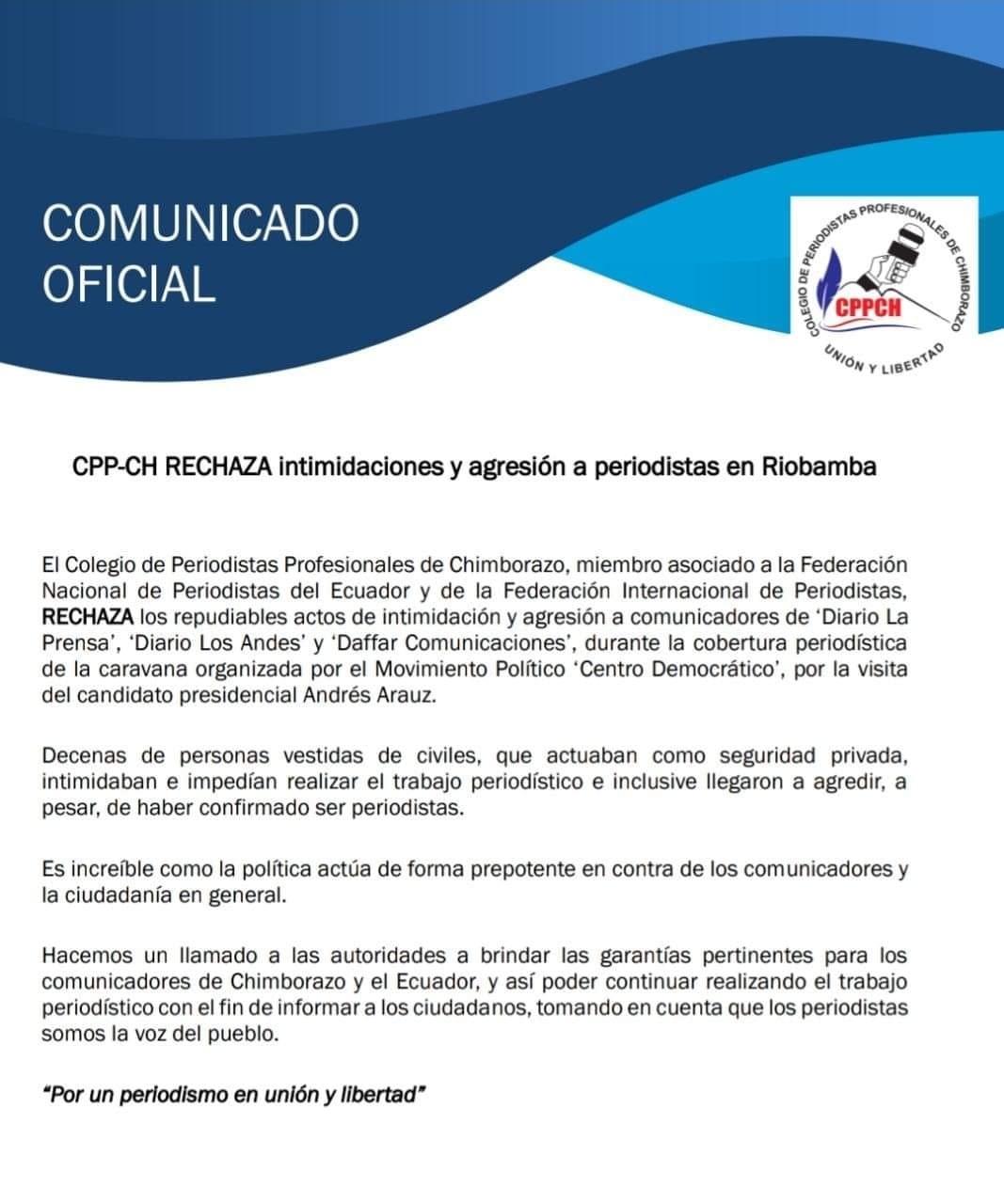 Por su parte, el Colegio de Periodistas Profesionales de Chimborazo publicó un comunicado en el que critica los "repudiables" actos de intimidación y agresión a comunicadores.
