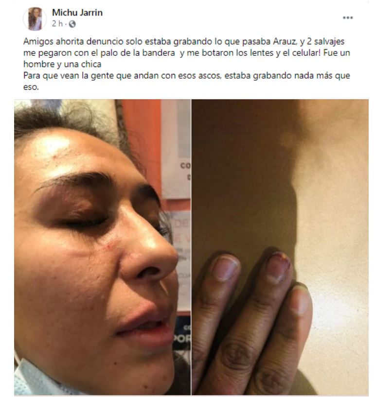 Mishelle Jarrín, una de las agredidas, comentó a Fundamedios lo que le ocurrió: “me encontraba con mis amigas a la expectativa de que pase el candidato Arauz, empecé a grabar con el teléfono y pasaron unas personas que le estaban cuidando, amenazando a la gente con que cuidado con realizar gestos obscenos o insultar a su candidato. Entonces, se acercó un tipo, sacándose la gorra, y golpeó la mano de mi amiga. En lo que estaba grabando, una chica de cabello rubio pasó botando el celular al suelo, rompiendo la pantalla del mismo. Al instante se acercaron dos hombres, uno me dio un puñetazo en el ojo y el otro me pegó en la cabeza con el palo de la bandera, lo que me provocó un moretón en el ojo y un golpe muy fuerte en la cabeza”.