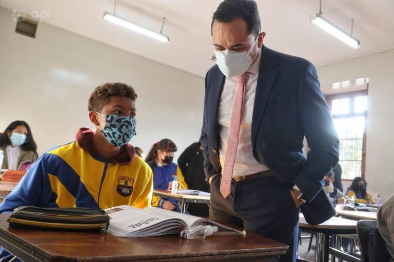 La ministra María Brown recalcó esta mañana en la Unidad Educativa Alfonso Laso Bermeo, en Quito, que el regreso a las aulas permitirá trabajar en la nivelación y reducción de brechas que han sido producto de la falta de presencialidad durante la pandemia.