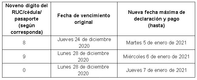 -Las obligaciones, cuyo plazo de declaración y su respectivo pago no se atribuya al noveno dígito del RUC y su vencimiento corresponda entre el 24 de diciembre de 2020 y el 1 de enero de 2021, podrán cumplirse hasta el martes 5 de enero de 2021.