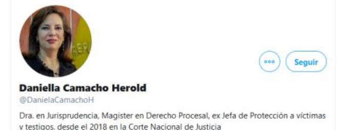 La jueza penal de la Corte Nacional de Justicia (CNJ), Daniella Camacho, quien hace pocos días dictó auto de llamamiento a juicio por cohecho al expresidente Rafael Correa, al exvicepresidente Jorge Glas, y a otras 19 personas dentro del caso Sobornos 2012-2016, antes conocido como 'Arroz verde', denunció públicamente que es víctima de suplantación de identidad.
