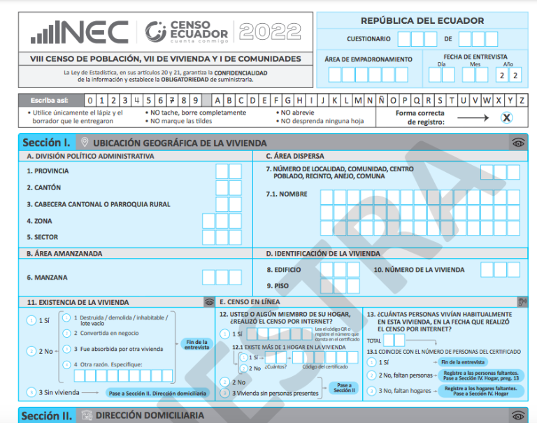 El cuestionario está dividido en tres temáticas: vivienda, hogar y población. En la primera sección debe especificar las características de su casa: ubicación, el tipo de vivienda, cuántas personas se encuentran allí, material de construcción, disponibilidad de servicios básicos, etc.