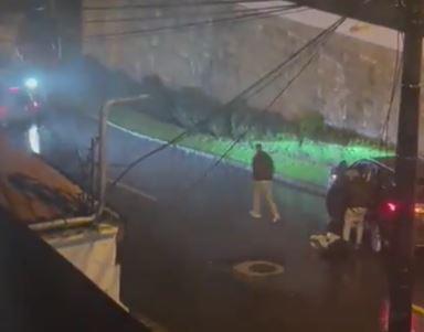 En cuestión de segundos, los dos individuos se alejan del sujeto herido e ingresan a los vehículos en los que arribaron a la escena del ataque, liberando a la mujer que habían intentado secuestrar.