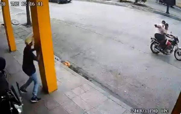 El insólito hecho fue grabado por cámaras de seguridad del sector. En el video también se ve cómo los proyectiles impactan la estructura de cemento sin herir al objetivo.