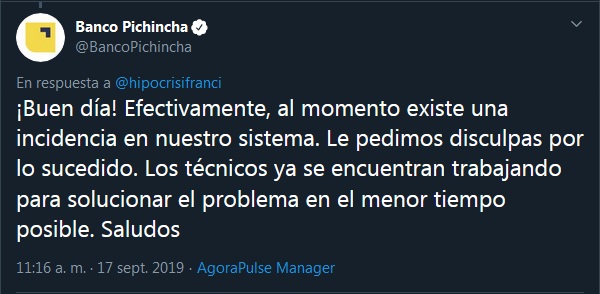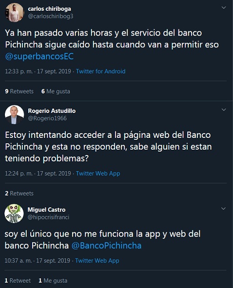 Las redes sociales son el espacio donde los clientes se vuelcan con sus quejas y donde buscan algún tipo de explicación o respuesta, por eso "Banco Pichincha" se mantiene como tendencia número uno en Ecuador. Las aplicaciones móviles relacionadas con el banco tampoco funcionan, según los usuarios de Twitter.