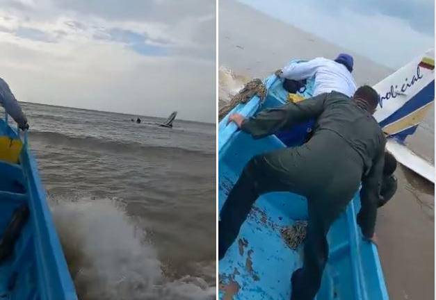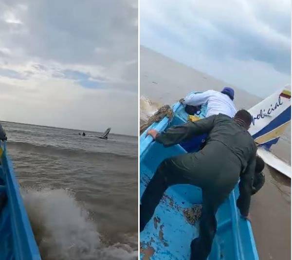 En redes sociales circulan videos en los que se observa el momento en el que los pescadores llegan a bordo de lancha para rescatar a las seis personas involucradas en el accidente.