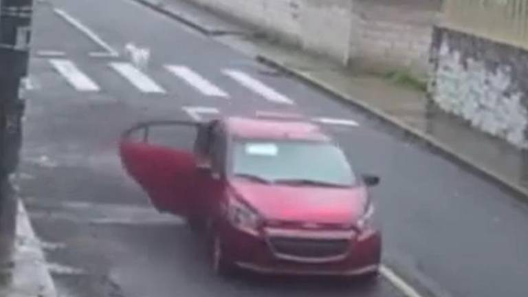 Cámaras de seguridad capturaron el momento en el que un auto rojo aceleraba velozmente tras forzar a un perro a bajarse del vehículo, abandonándolo en medio de la calle al norte de Quito.