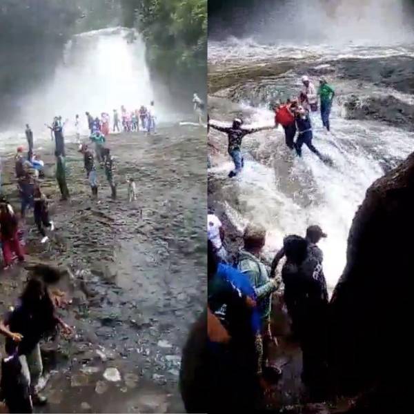 En redes sociales se ha empezado a viralizar un video, en el que se observa a varias personas al pie de la cascada. De pronto, se dan cuenta que la corriente aumenta de intensidad y comienzan a salir del lugar.