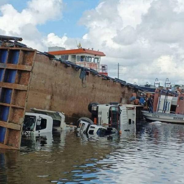 En el sector de Los Esteros, ubicado al sur de Guayaquil, una gabarra que transportaba tres volquetas se hundió en los alrededores de un muelle, durante la mañana de este jueves 16 de marzo.