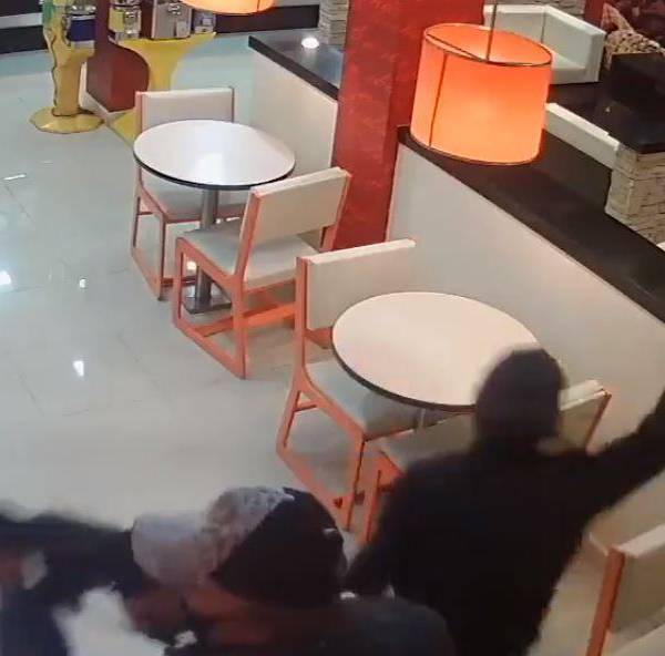 Cámaras de vigilancia captaron el momento en el que dos individuos, uno armado con un fusil y el otro con una pistola, ingresaron al local apuntando hacia los empleados y comensales.
