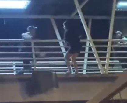 En el video, se observa a la mujer de pie al borde de la estructura, sujetándose a las barreras que delimitan la zona de circulación peatonal mientras queda de espaldas a la vía, a metros sobre el pavimento.