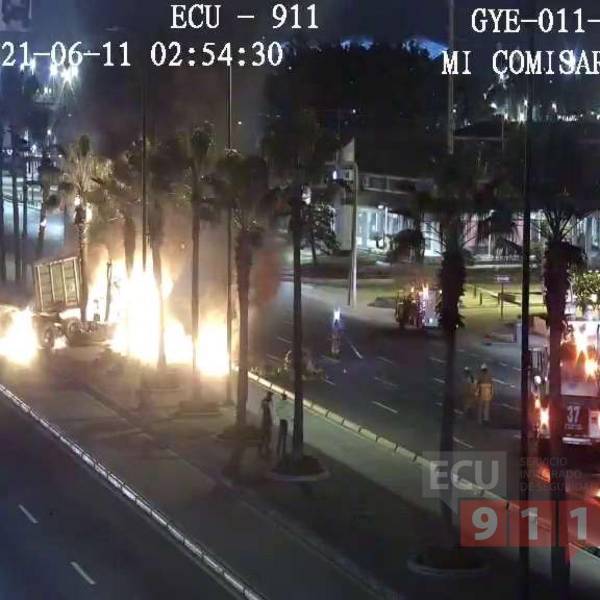 Las cámaras del ECU 911 registraron el incendio de un vehículo tipo tráiler en la intersección de la avenida de las Américas e Isidro Ayora, en el norte de Guayaquil. El hecho se registró a las 2h50 de este viernes 11 de junio.