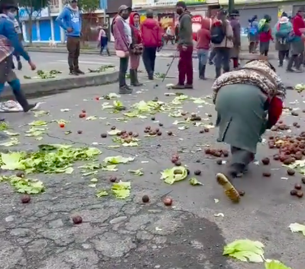 En videos difundidos en redes sociales se evidencian lechugas y papas tiradas en el piso. Mientras, algunos ciudadanos aprovechan el conflicto para coger los productos. En cambio, los comerciantes reclamaban que quieren trabajar, pero mujeres manifestantes agreden tirando las hortalizas en su rostro.